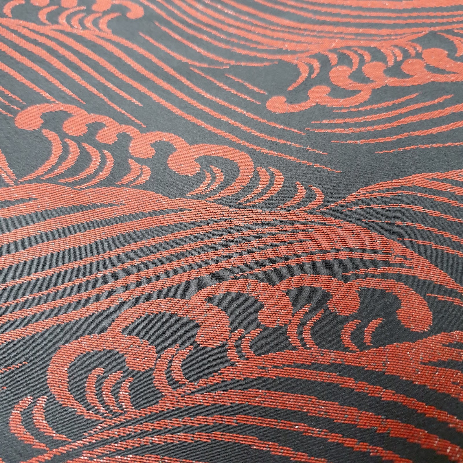 Haori in seta nera e con disegno di onde in lacca rossa, (tessitura hikihaku); fodera in seta leggera jacquard, dipinta a mano.
